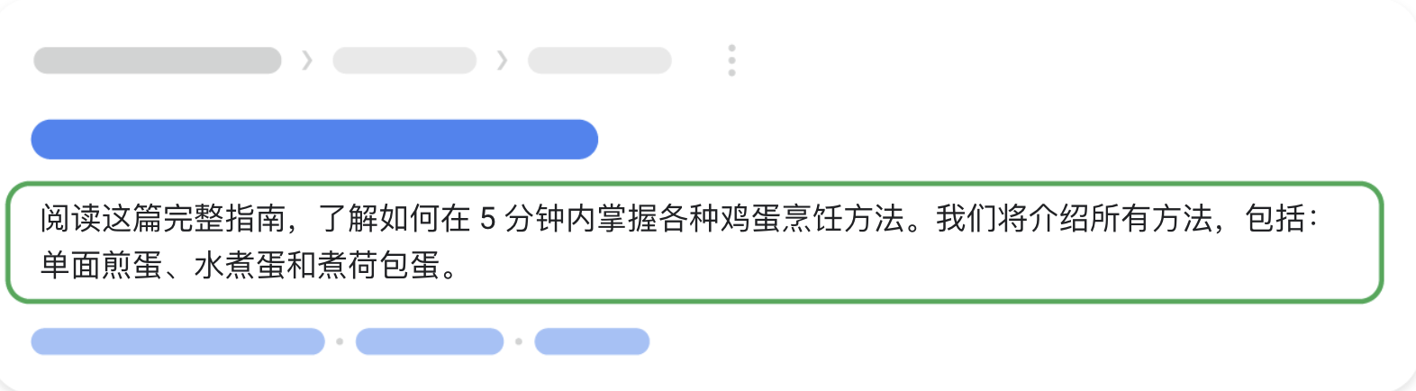 在标题链接下方,搜索结果通常包含目标网页的说明,可帮助用户决定是否应点击该搜索结果。这称为摘要